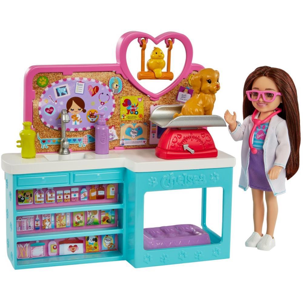 A boneca morena Chelsea pode brincar de veterinária de animais de estimação assim como sua irmã mais velha Barbie® com o playset Barbie® Chelsea® Pet Vet. Vestida com um lindo casaco e vestido branco, a boneca Chelsea® está pronta para começar o dia. Ela pode examinar seus pacientes na mesa do veterinário com seu estetoscópio e verificar seu peso na balança móvel. Peças adicionais de contar histórias para se divertir incluem 4 animais de estimação (2 cachorrinhos, 1 gatinho e 1 pássaro com um balanço que se move). Há também 18 peças adicionais, como uma cama para animais de estimação, torre para gatos, instrumentos médicos, prancheta, um cone, frasco de bomba, frasco de remédio, caixa para animais de estimação, pratos de alimentação, gulose