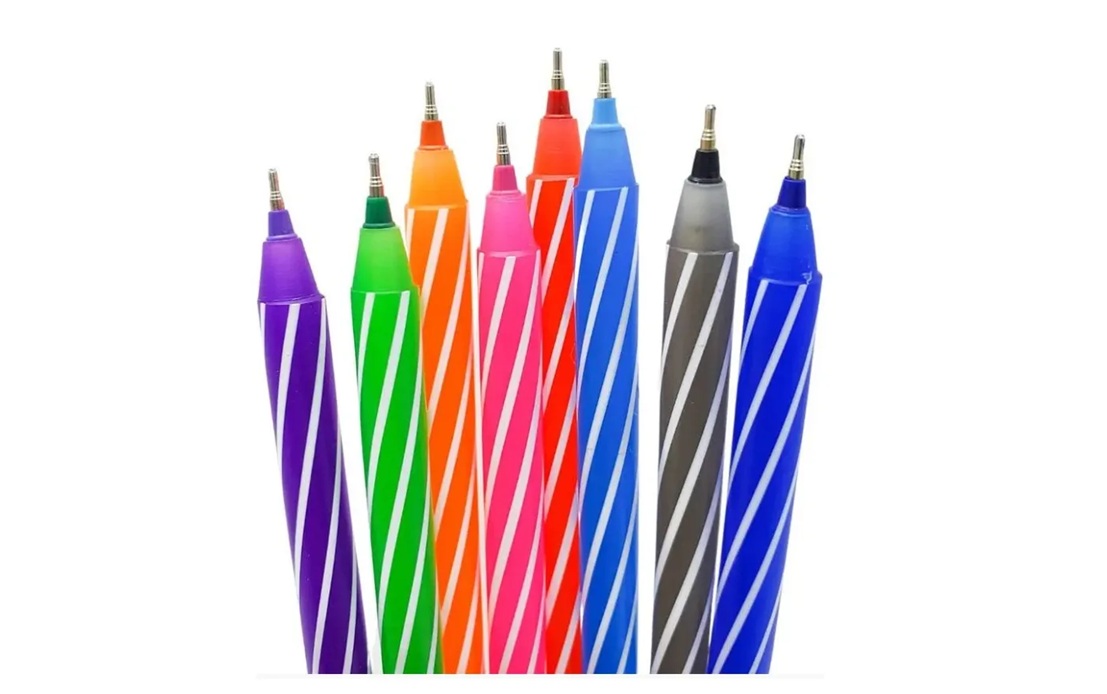 Embalagem: 8 Canetas com tinta nas Nas Cores (Azul Claro, Laranja, Roxo, Rosa, Verde, Vermelho, Preto, Azul escuro)