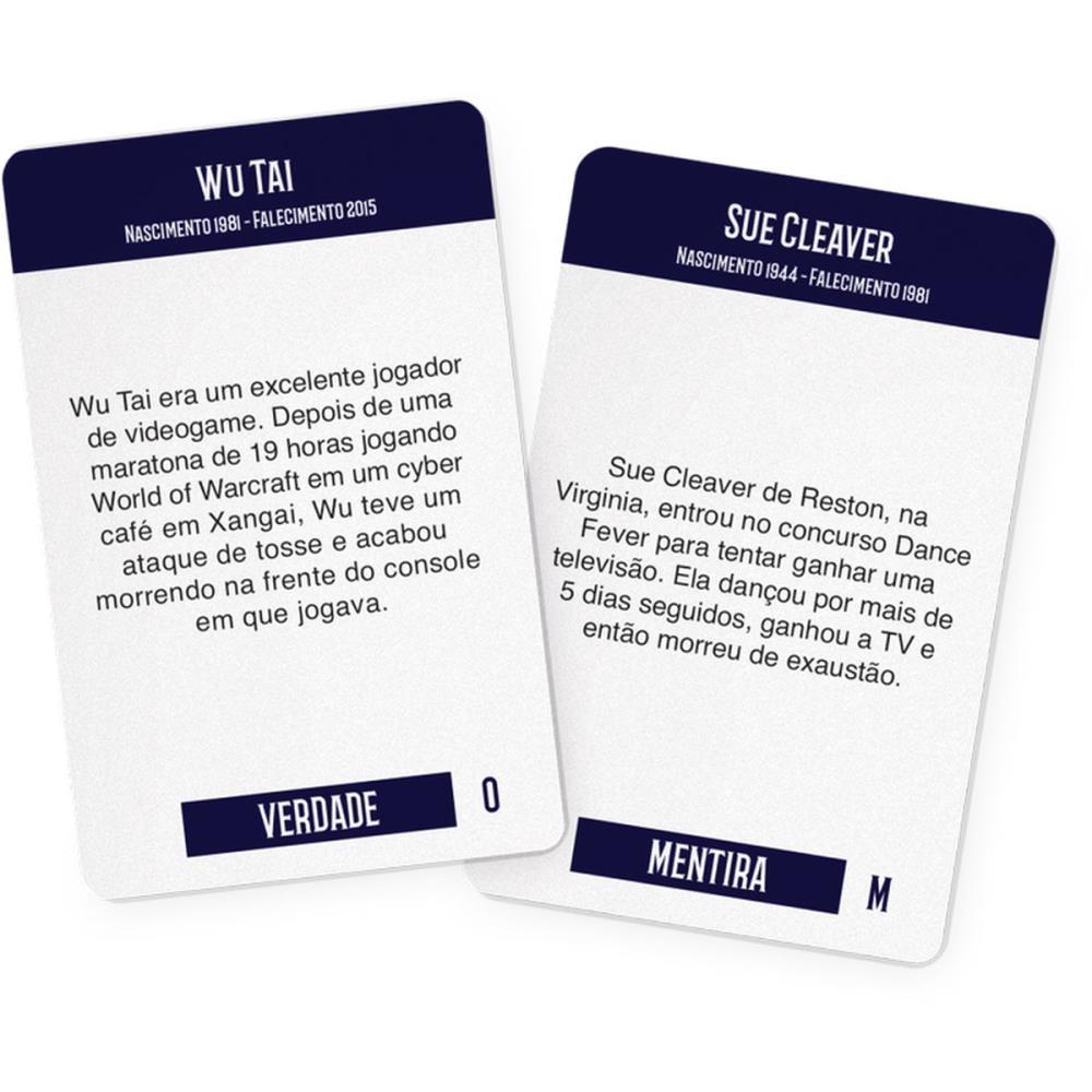 Toda carta de pergunta contém uma Morte Estúpida, porém é verdade ou mentira?. Responda corretamente e você fugira do Peão da Morte, mas se responder errado o Peão da Morte se aproximará. Seja o último jogador no tabuleiro ou colete todas as letras da palavra MORTE e venca o jogo.Tamanho da embalagem: 5,5 cm (L) x 31 cm (A) x 21,5 cm (P)Caixa master com 4