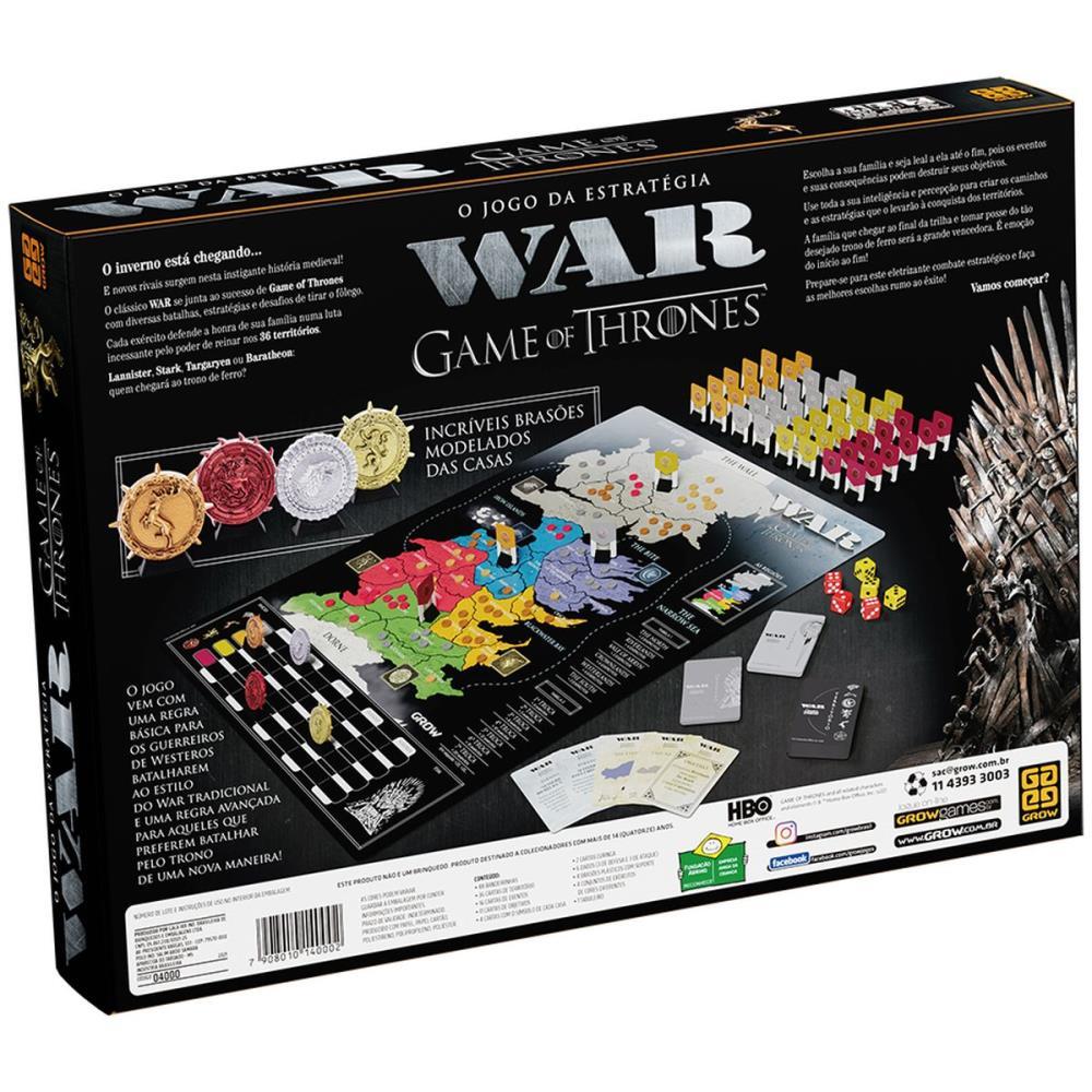 O clássico War agora junto ao sucesso de Game of Thrones! Escolha a sua família e seja fiel a ela até o fim! Lannister, Stark, Targaryen ou Baratheon: quem chegara ao trono de ferro? É emoção garantida durante toda a partida! Prepare-se para esta incrível batalha, onde as melhores escolhas e estratégias te levarão a vitoria! Incríveis brasões modelados das casas! Este eletrizante jogo que irá te desafiar do começo ao fim! Cada exército defende a honra de sua família numa luta incessante pelo poder de reinar nos 36 territórios. O jogo vem com uma regra básica para os guerreiros de Westeros batalharem ao estilo do War tradicional e uma regra avançada para jogadores que preferem batalhar pelo trono no estilo Game of Thrones!Tamanho da embala